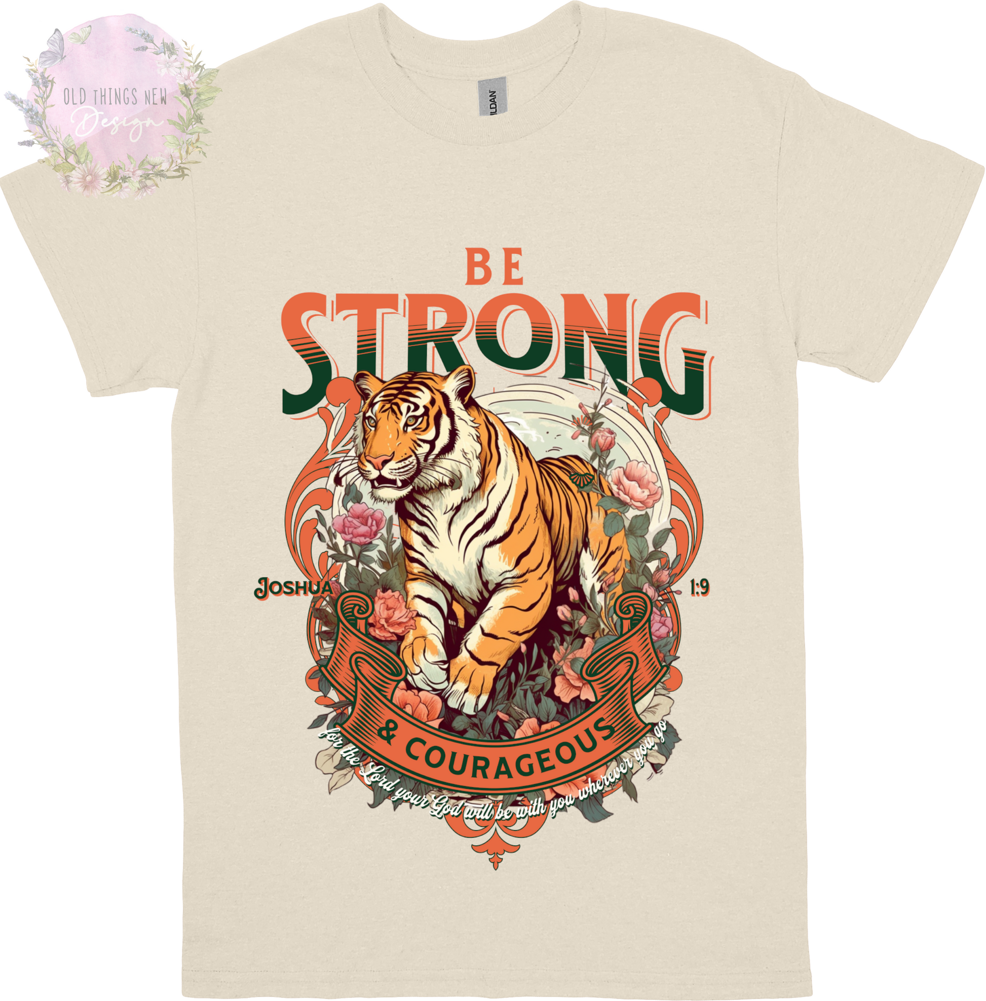 "Find strength and courage with our Be Strong And Courageous tee featuring the classic verse from Joshua 1:9 and an emboldened tiger graphic. Let this powerful message and fierce design inspire and motivate you to tackle any challenge!"
