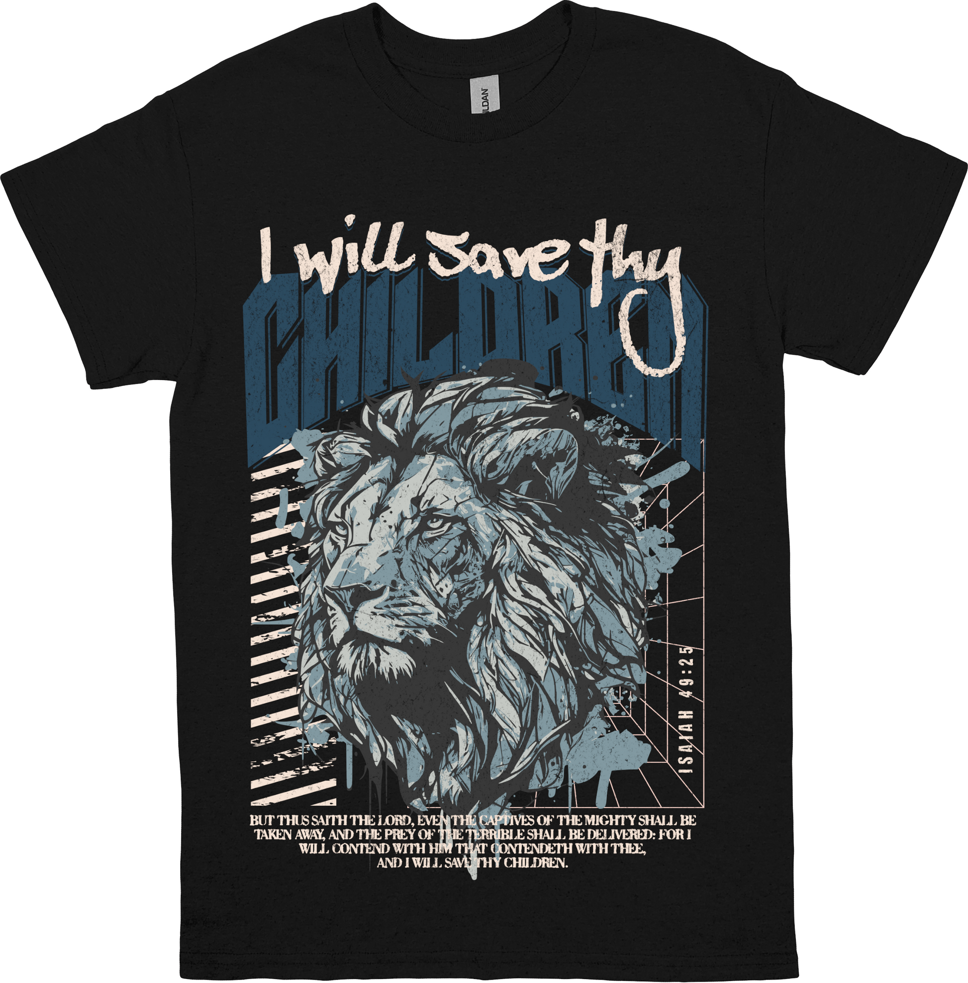 Stand strong for the future with our "I Will Save Thy Children T-Shirt". This modern and colourful graphic tee features the powerful scripture of Isaiah 49:25 l, with a bold lion symbolizing strength and courage, this shirt is a reminder to fight for our kids and their future.