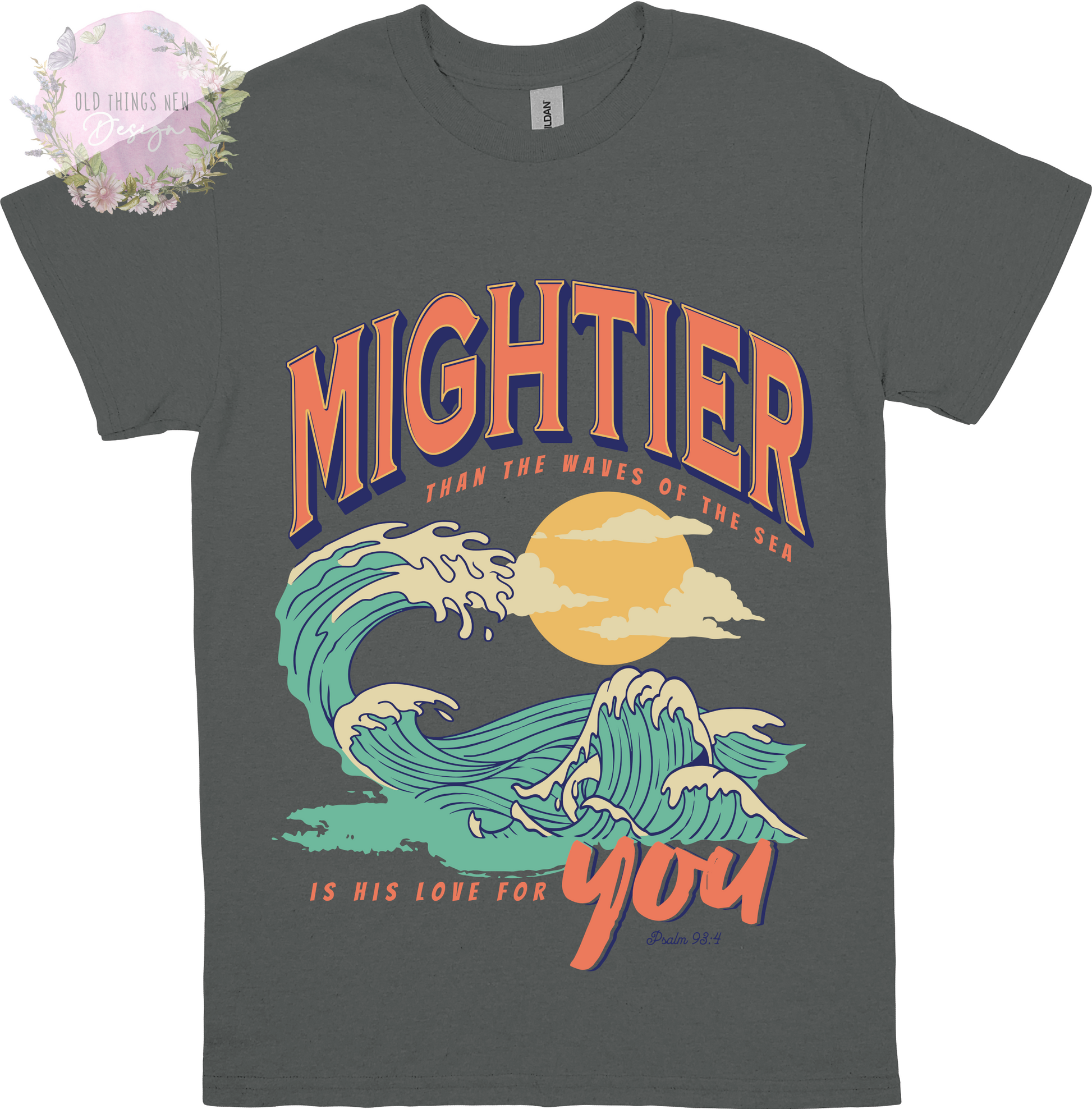 Show your faith in style with our Mightier Than The Waves T-Shirt! Featuring a cool retro graphic and the inspiring Bible verse "Psalm 93:4", this shirt is a reminder that no matter what life throws at you, God's love is always greater. Wear it and feel the love.