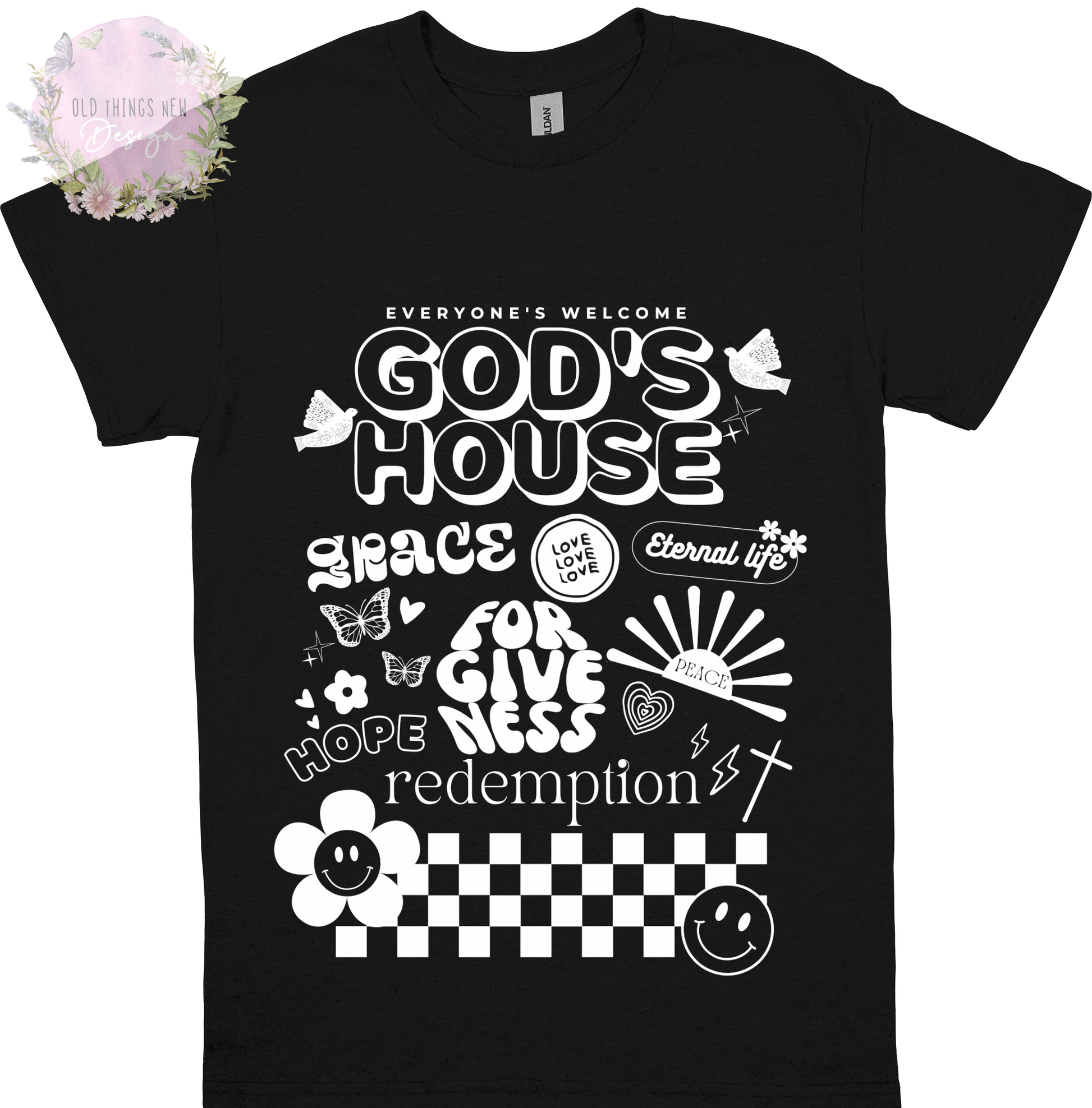 Experience ultimate comfort and style in our God's House T-Shirt. With a retro design and multiple color options, this tee is perfect for everyday wear. Show your faith with confidence and comfort.