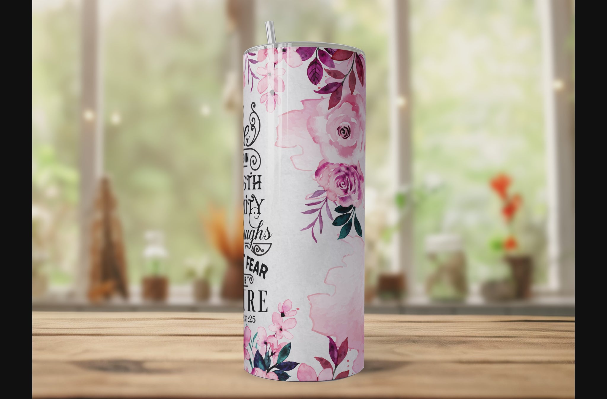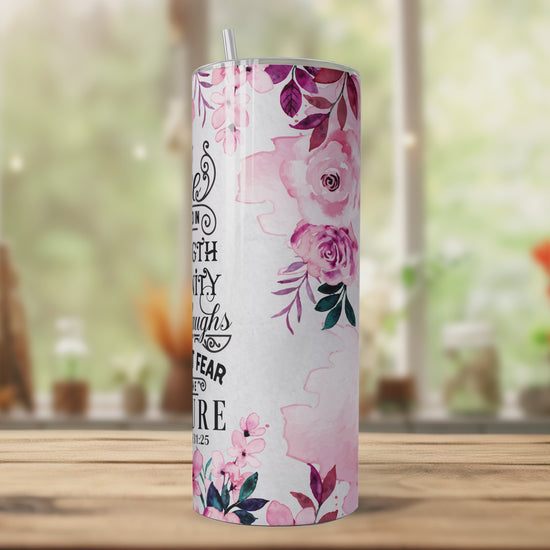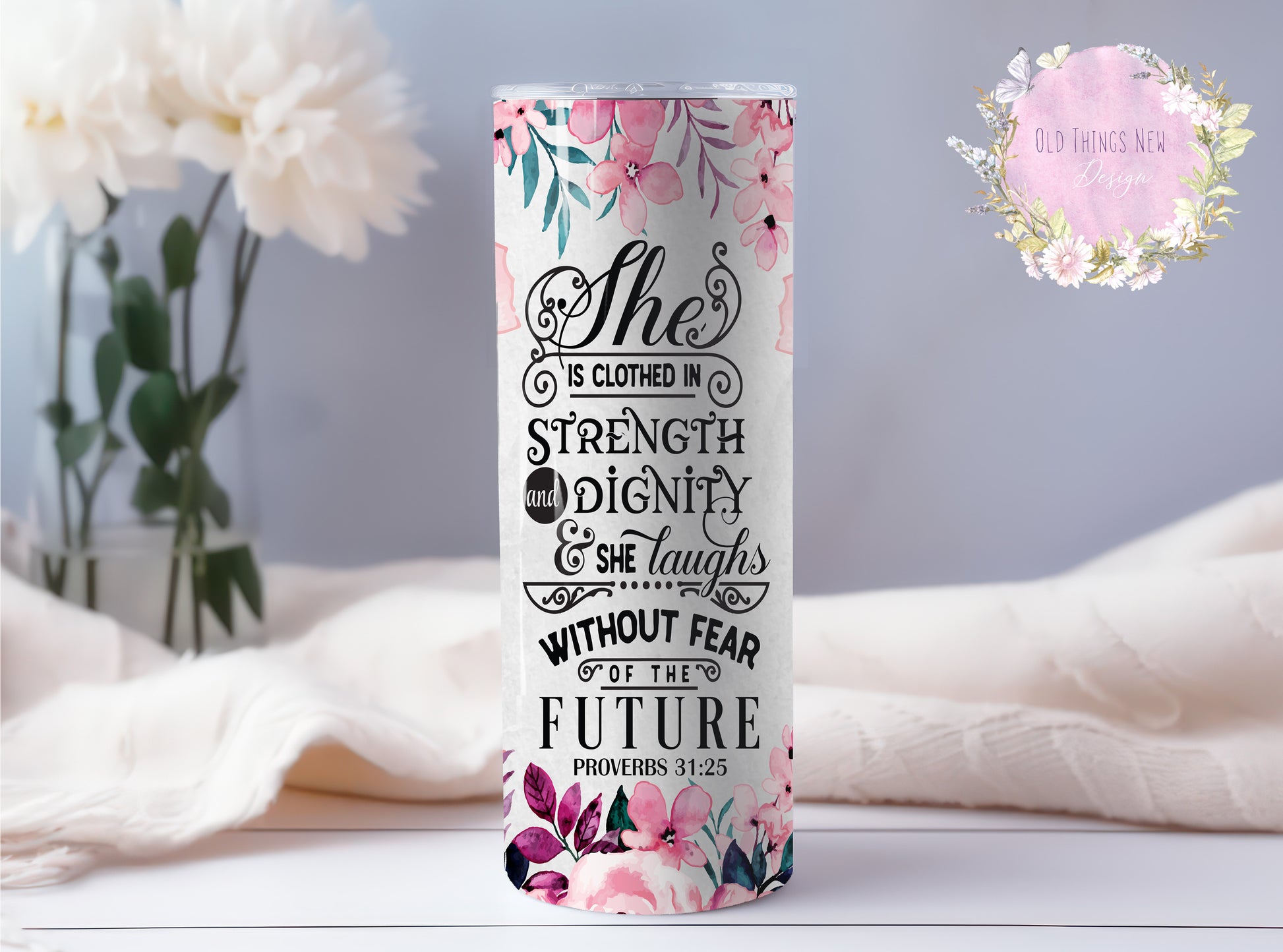 💗This tumbler features a watercolour floral design with the Bible verse Proverb 31:25 "She is clothed in strength and dignity and she laughs without fear of the future" 💗