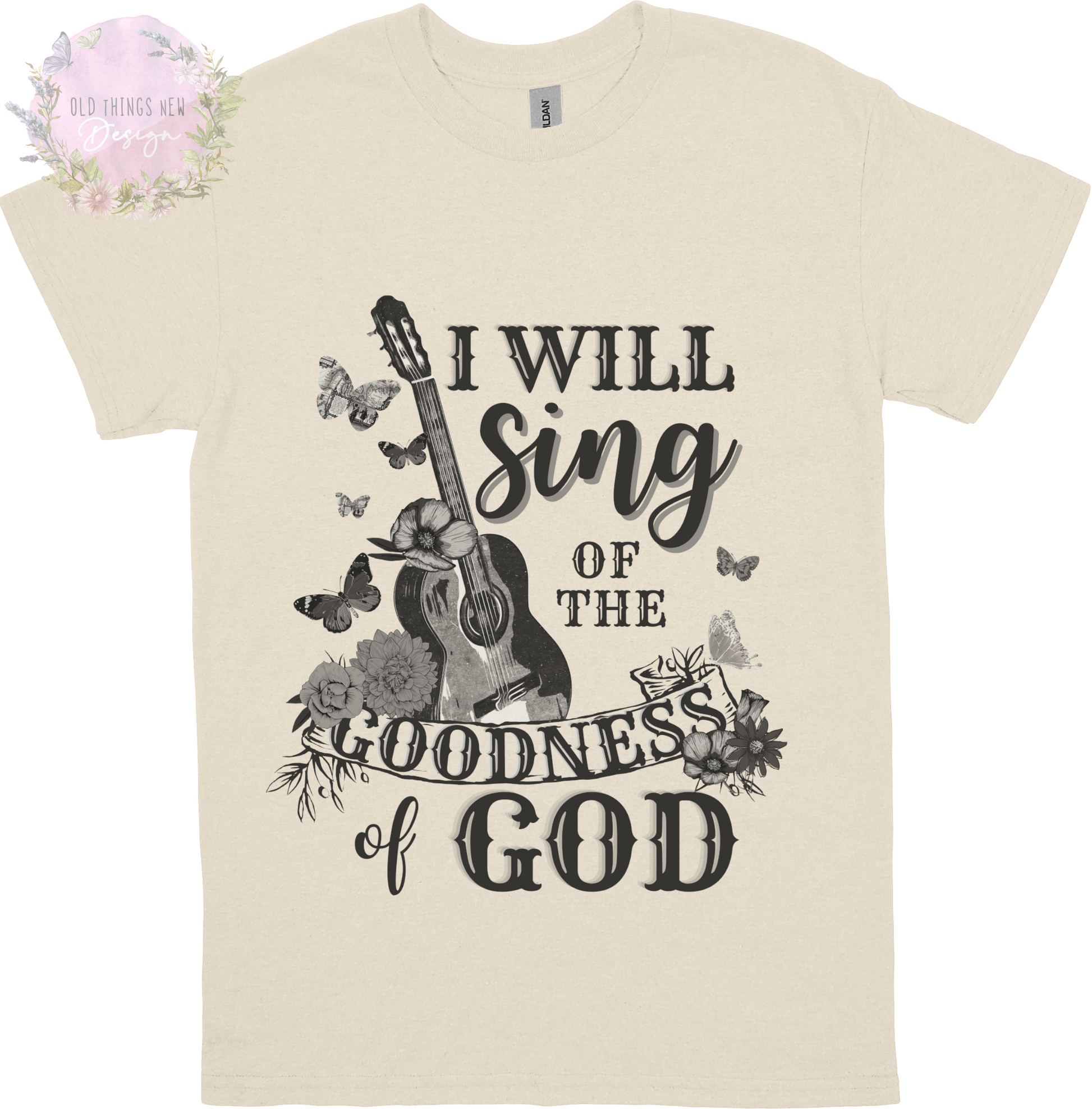 Celebrate and proclaim your faith with our "I Will Sing Of The Goodness Of God" T-shirt. Featuring the powerful lyrics from the beloved song, this shirt is a reminder of God's faithfulness in your life. Let your shirt be a testimony of His goodness to all who see it. Available in multiple colour designs.