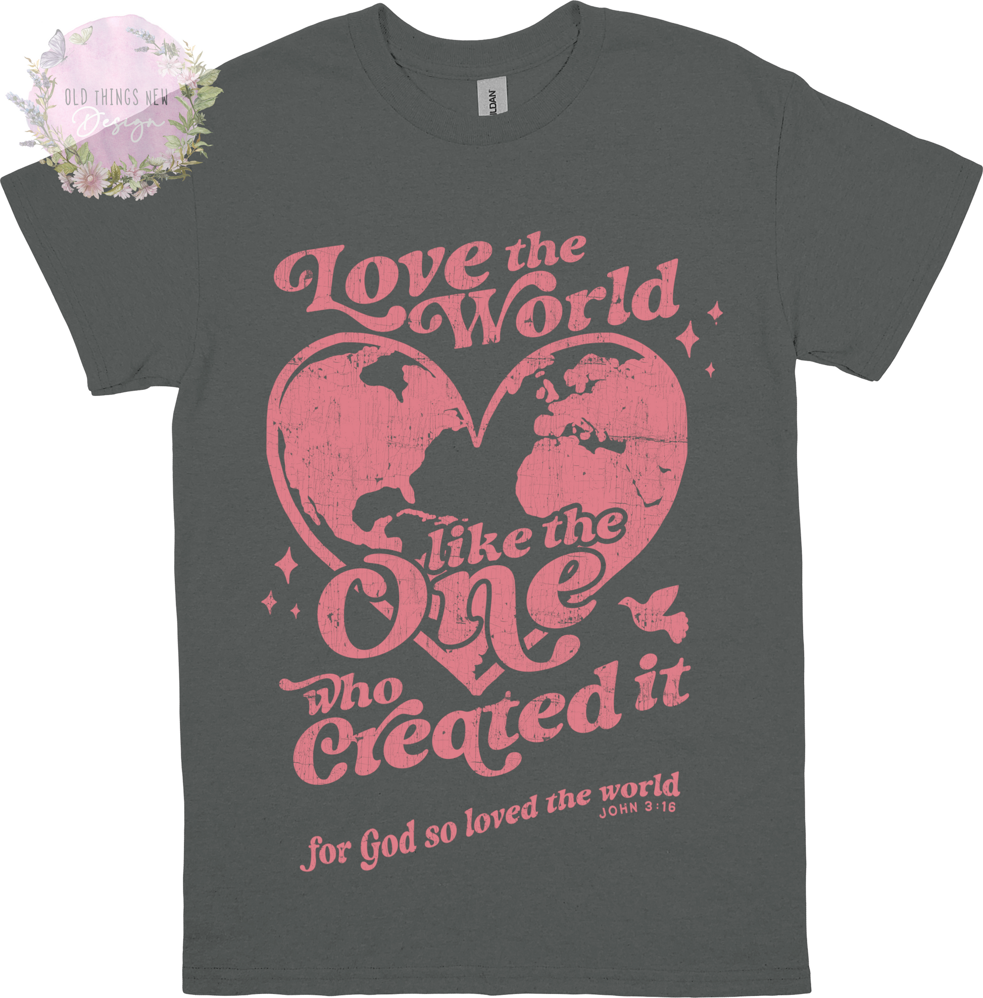 Show off your faith with our vintage-style Love The World T-Shirt! Available in 6 sizes to fit your style whether fitted or oversized. This shirt is the perfect way to express yourself and inspire others, with one of worlds most well known bible verses John 3:16. Join us in spreading love and positivity to the world through this stylish and comfortable t-shirt.