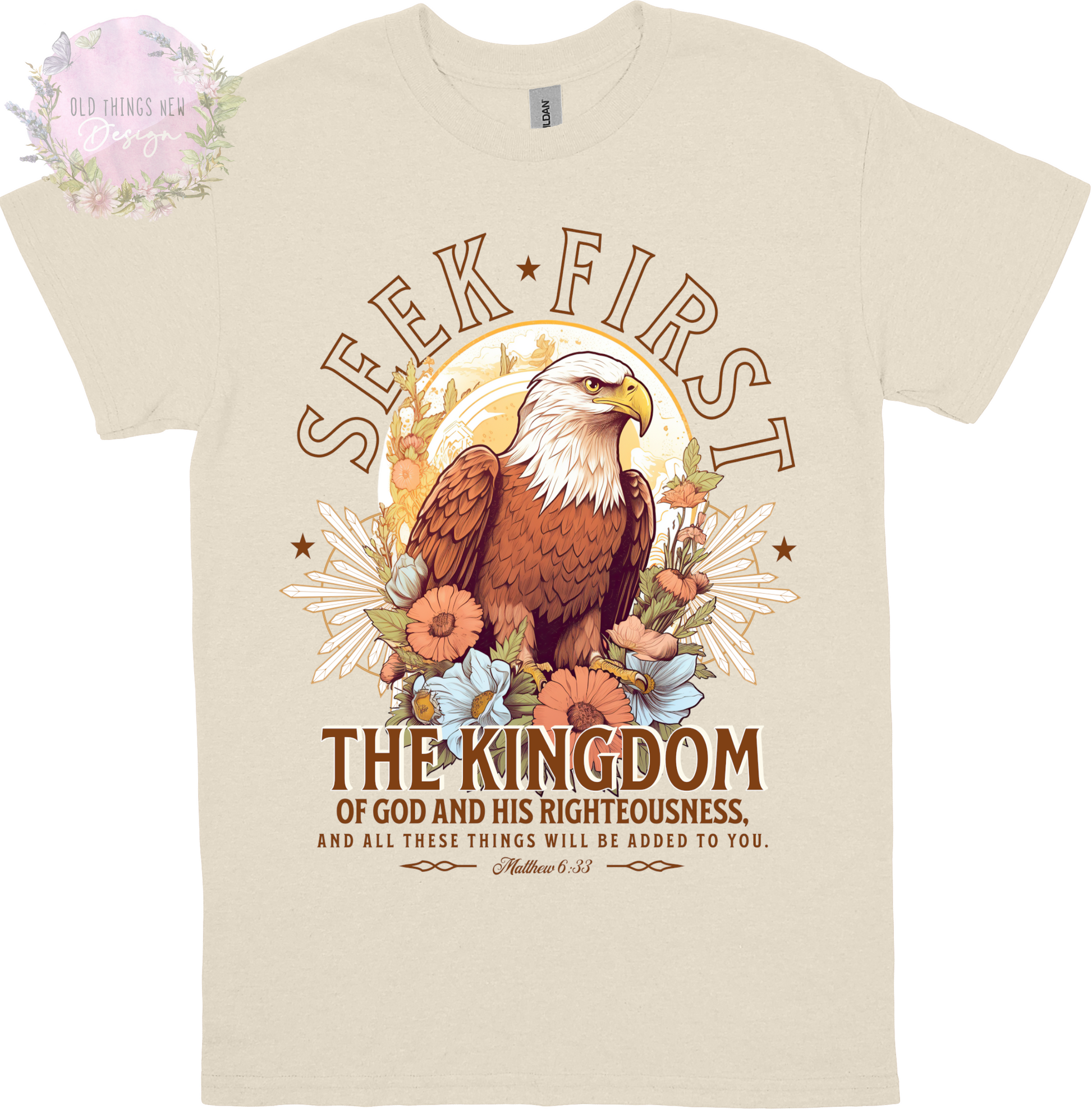 Experience the power of seeking first the kingdom with our modern style t-shirt! Featuring a Dark text version and unique graphics, this shirt serves as a reminder to prioritize what truly matters. Let it be a conversation starter and inspire those around you.
