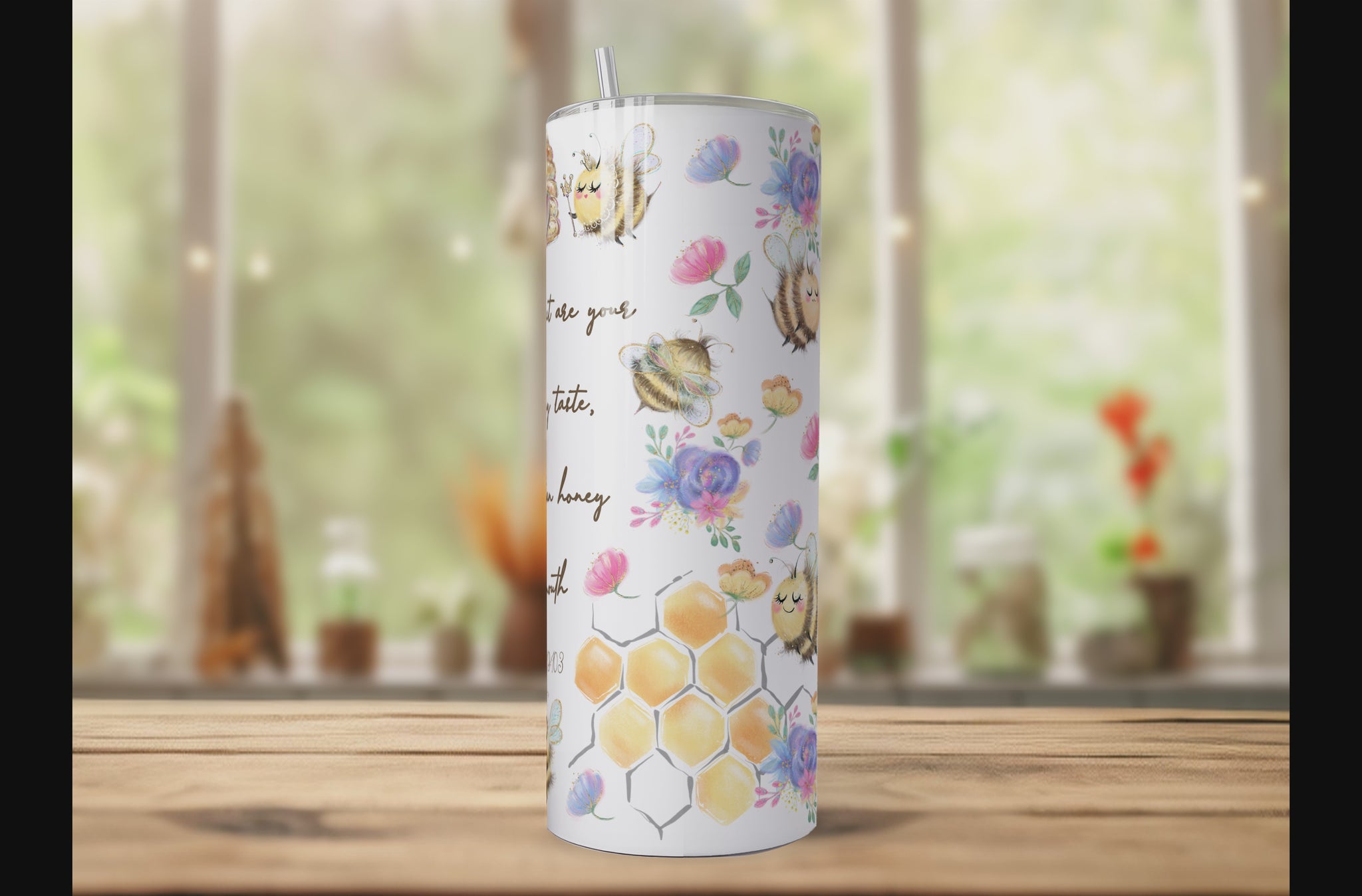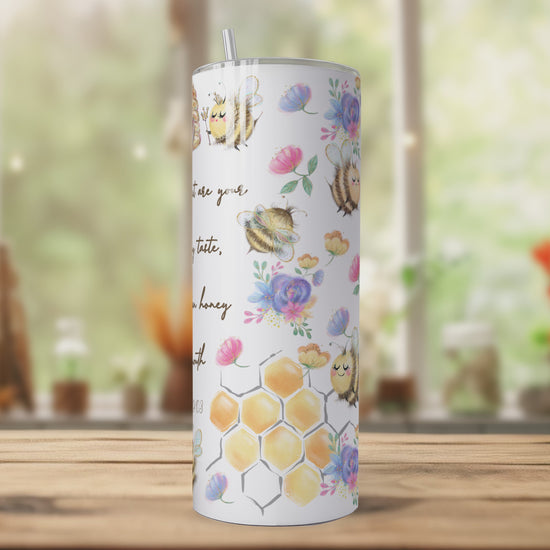 πThis tumbler features a watercolour Bee design with the Bible verse Psalm 119:103 - "How sweet are your words to my taste, sweeter than honey to my mouth"π