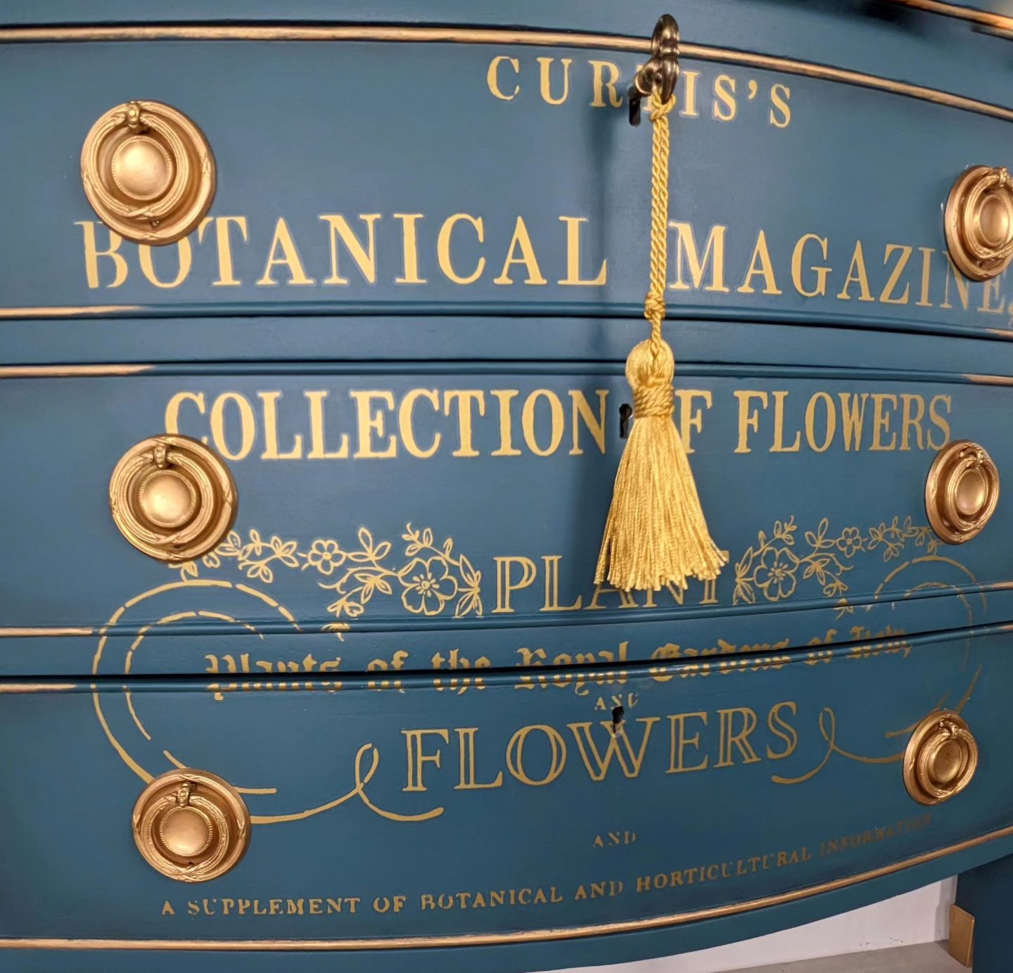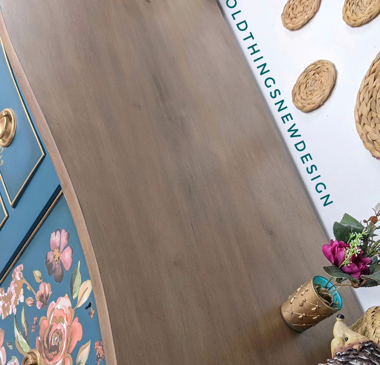 Beautifully upstyled solid wood sideboard. This piece has been brought back to it's original finish before being primed, painted and sealed both inside and out. With Stunning floral and gold detail throughout, this piece is sure to Garner attention in any home. All doors and drawers are fully lockable with masterkey.