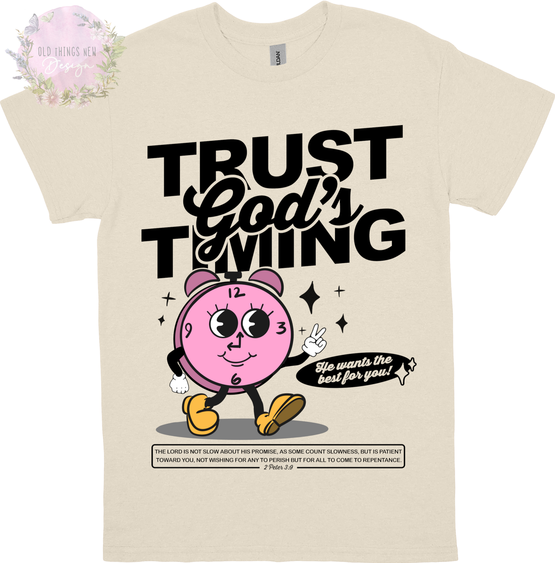 This retro-inspired T-shirt bears a powerful message from 2 Peter 3:9 - trust God's timing. Wear this shirt as a reminder to have faith and trust in God's perfect timing in your life. Let this scripture bring peace and encouragement to those around you!